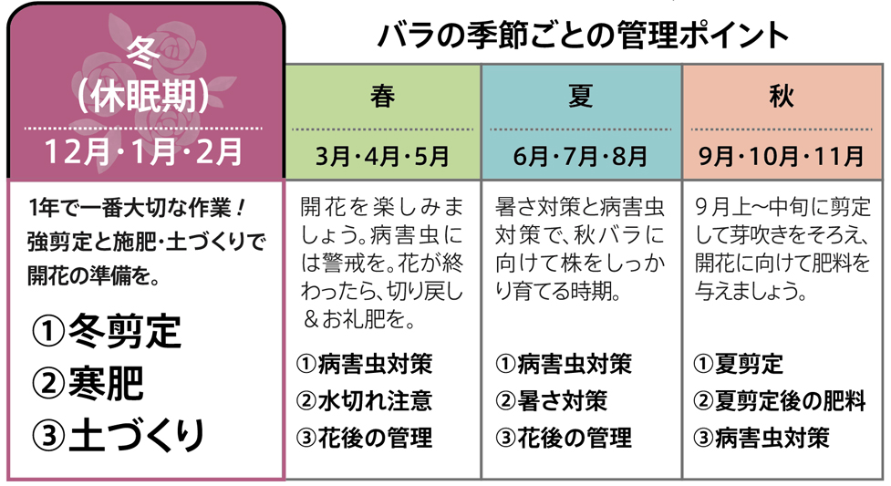 また、新しくバラを育て始めるなら、この時期に苗を購入し、植え替えるのがおすすめです。新しく苗から育て始める人も、冬にやっておきたい作業はほぼ同じ。では、それぞれの作業を詳しく見ていきましょう。「村っちポイント」にも注目!