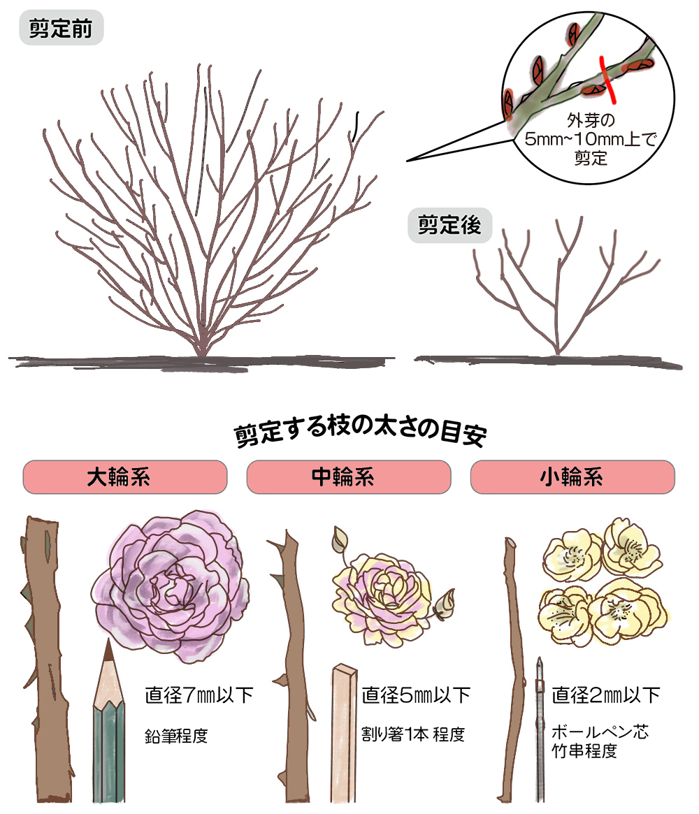 剪定する場所の基本は「外芽の上で切ること」。葉の付け根には、必ず芽があります。その中で、株の外側を向いていて、プクっと膨らんでいるのが外芽です。この外芽の5ミリ~1センチ上で剪定しましょう。なぜ、外芽の上で切るのか?それは、株の内側に向かって枝が伸びると、枝が混み合って風通しや日当たりが悪くなるからです。外芽がどれかイマイチわからない…という人は、自分が伸ばしたい方向の芽の上で剪定しましょう。剪定する枝の太さの目安はイラストの通りです。これより細い枝は、思い切って剪定しましょう!花の大きさを忘れてしまったという人は、今ある枝を太い方から半分くらい残すイメージで。