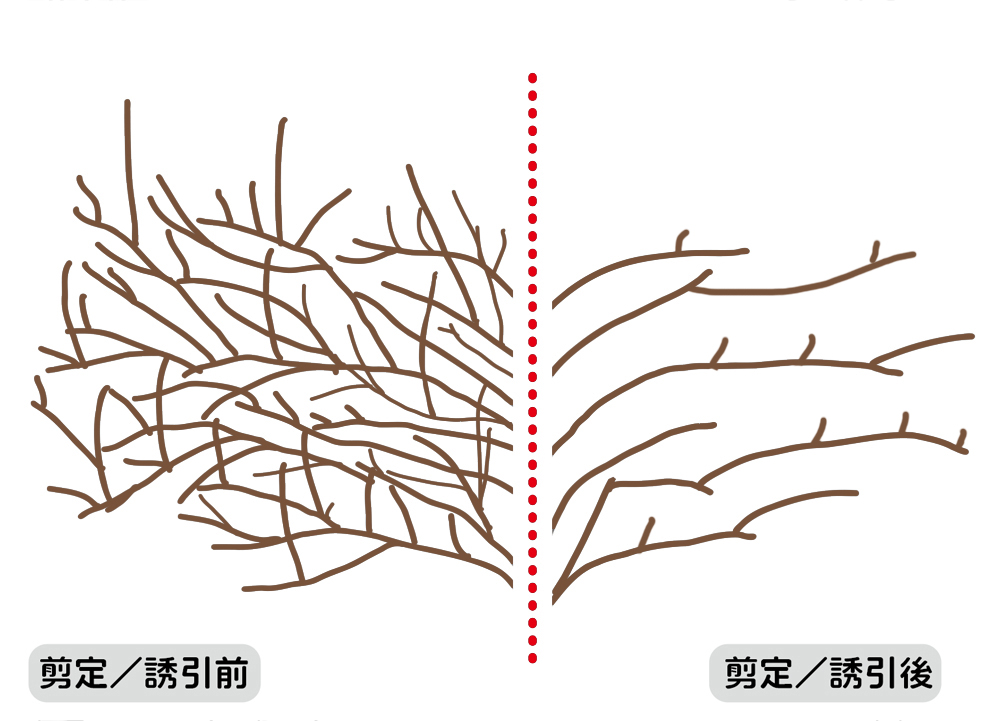 冬の作業の中でも最も重要な作業が「冬剪定」。よりよい花を咲かせるため、そして枝を更新して株を若返らせるために行います。冬剪定は<強剪定>です。剪定の目安は、元々の高さの1/2程度まで。細い枝や元気のない古い枝は、元からどんどん切ってしまっても大丈夫。枝葉が重ならないよう風通しをよくして、全体の日当たりがよくなるようにイメージしながら剪定していきましょう。