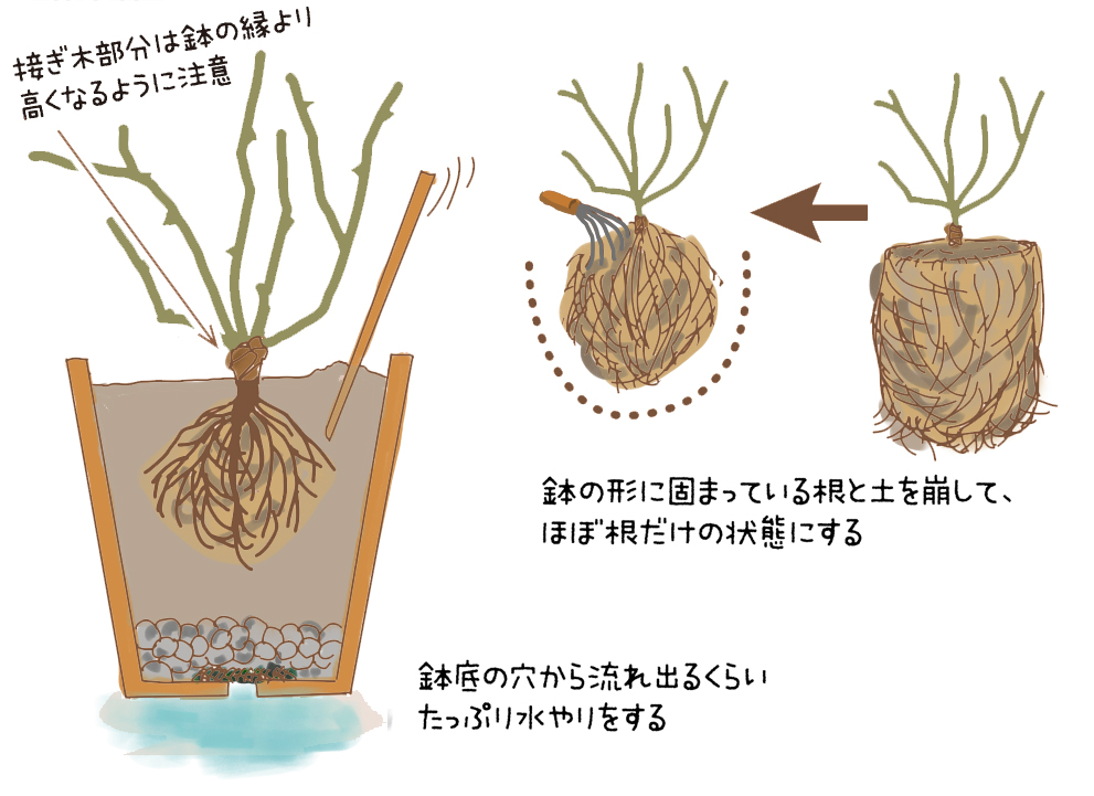 鉢植えのバラは、できれば毎年、少なくとも2年に一度は植え替えをしましょう。新しく苗を植え付ける場合も、やることは同じ。まずは根鉢を崩すことから始めます。鉢から取り出すと、根と土が一体となって固まっているかと思います。これが根鉢です。この根鉢に、熊手やほぐし棒などをプスプスと刺して、塊をほぐし古い土を落とします。ここで、細く白い根は切れても構いません。ただし、茶色く太い根は傷をあまりつけないように気をつけてください。古い土を落としたら、新しい土に植え替えます。棒などを使って根のすきまにしっかりと土を入れ込みます。土を替えたあとは、水をたっぷりとあげてください。土表面が水でヒタヒタになる → 土が水を吸う → 流れ出る、を3回ほど繰り返しましょう。