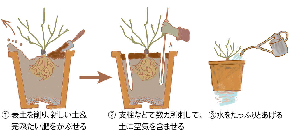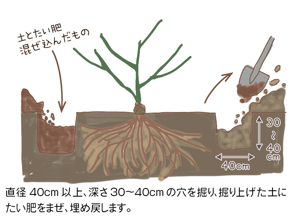 地植えの場合は、2~3年に一度、株の周辺にたい肥をすき込みましょう。株元から30センチほど離れた場所に直径40センチ程度、深さ30~40センチ程度の穴を何か所か掘ります。掘った土にたい肥を混ぜて穴に埋め戻します。最後に、土が水を吸わなくなる程度にまで、繰り返し水やりをしましょう。周りに植物などがあり、すき込むのが難しい場合は、株周辺の何か所かを掘って、たい肥を入れるだけでもOKです。それも難しければ、表土を少し削って雑草を取り除き、たい肥をマルチングしましょう。